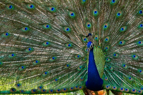 The Indian Peafowl or Blue Peafowl (Pavo cristatus) is a large and brightly colored bird of the pheasant family native to South Asia, but introduced and semi-feral in many other parts of the world. It is the national bird of India.