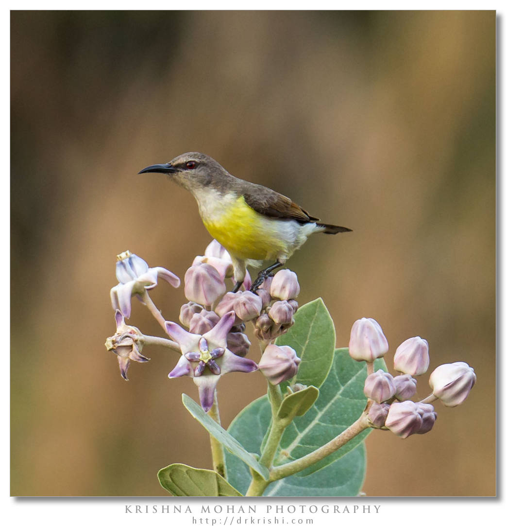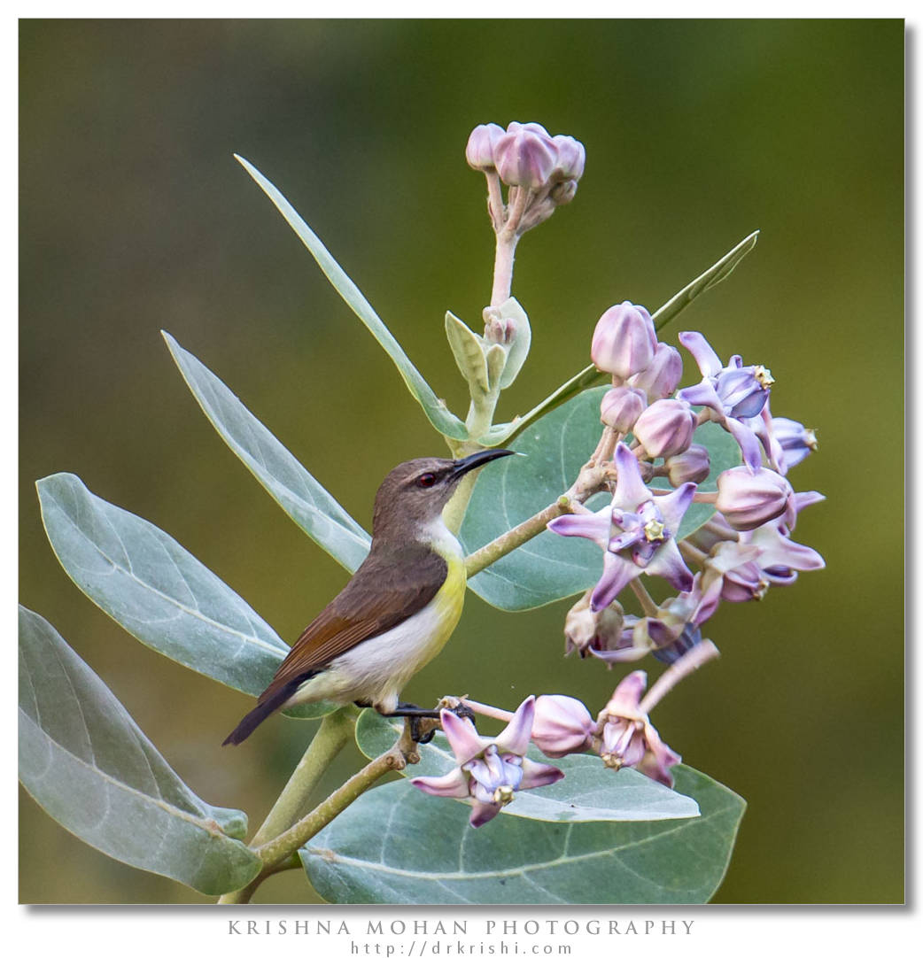 I saw these sunbirds feeding on the Calatropis flowers. Both male and female were taking turns to feed a small bunch of these crown flower nectar. As it was late December evening light which was quite diffuse and low, I used a relatively slow shutter speed (1/320th of second) to capture these birds at ISO 1250. I was using Canon EOS 5D Mark III with my Canon EF 300mm f/2.8L II IS USM and Canon EF 2X III Extender. This combo gives me sharpest results at f/6.3 aperture. So I used that setting. These sunbirds were moving fast but were stopping just a fraction of second between their flutter and that gave me opportunity to click them at such a speed. I was using my Benro C45T Carbon Fiber Monopod for support.